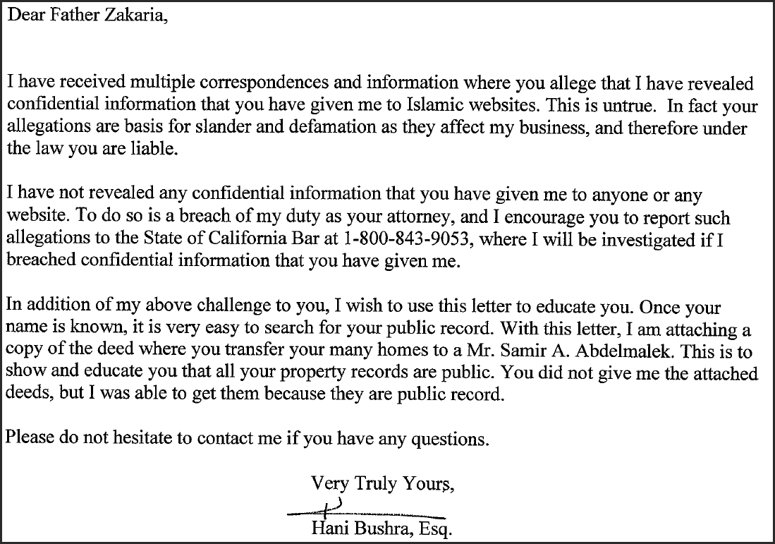 تحدثت مع هارون على هاتف صديقي في تلك الليلة وحاول أساساً العصف بالمحادثة بغضب وحاولت أن أضغط عليه للإستجابة لمطالب المحامي، ورفض إعطاء القمص زكريا حتى أشرطة برامجه ورفض الرد على أسئلتي حول ما تردد حول الشيخوخة العقلية للقمص زكريا وهكذا دواليك
