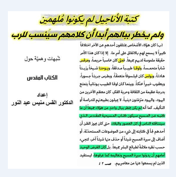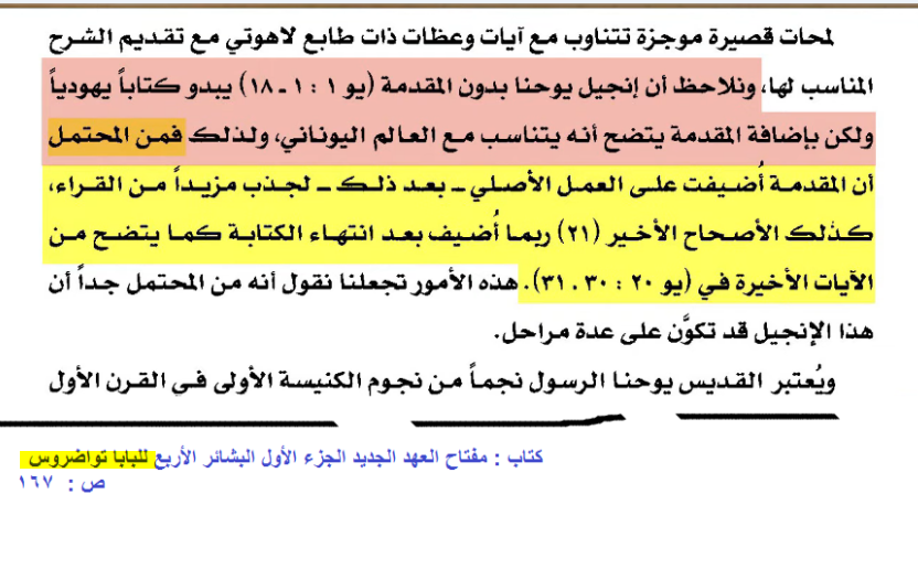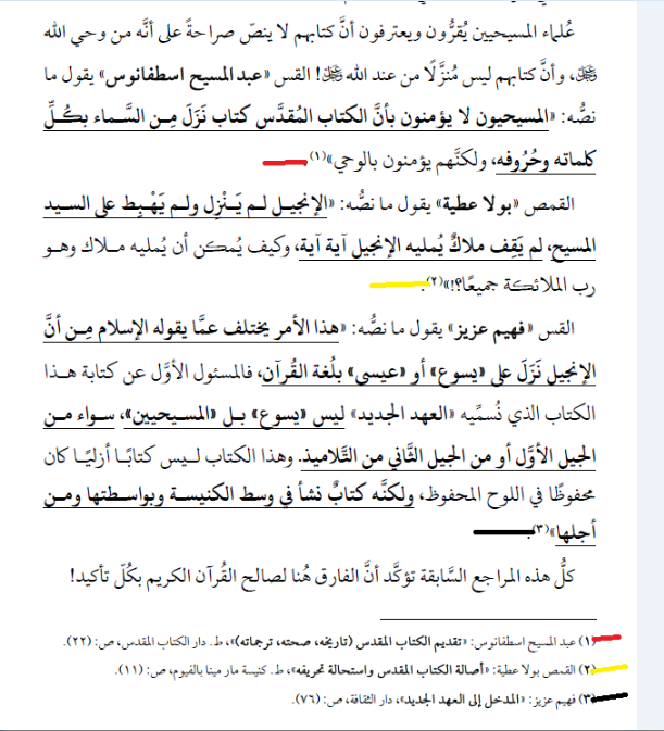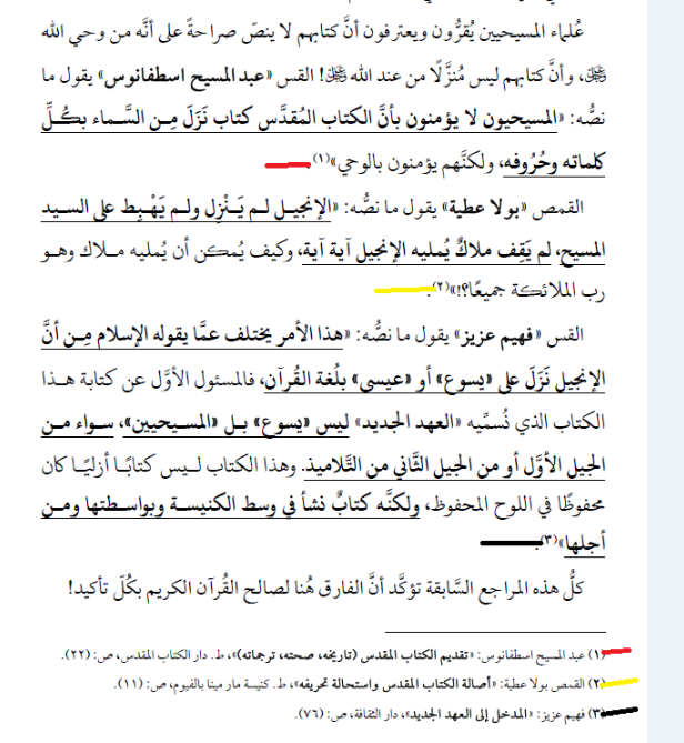 ↑ الدليل الأول: الذين قاموا بكتابة الكتاب المقدس أكثر من ثلاثين نبيًا وحواريًا، وكلهم مجمعون على حقائق الإيمان المسيحي. ومن أولوياتها حاجة العالم إلى الخلاص، و ألوهية السيد المسيح، وجوهر الله الواحد الثالوث، وحقيقة صلب المسيح وقيامته. وذلك بالرغم من تنوّع ثقافاتهم واختلاف عصورهم وطول مدة الزمن الذي كتبوا فيه وهو أكثر من ألف وخمسمائة سنة بدءًا من موسى النبي كاتب التوراة إلى القديس يوحنا الرسول كاتب سفر الرؤيا.