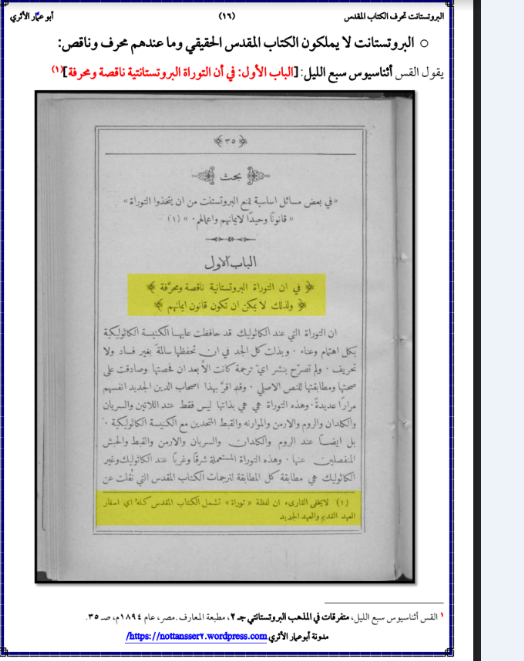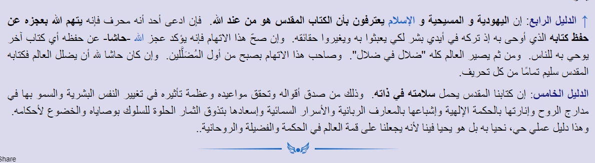 : (كيف تسألون أهل الكتاب عن شيء، وكتابكم الذي أنزل على رسول الله ﷺ أحدثُ، تقرؤونه محضًا لم يُشب، وقد حدثكم أن أهل الكتاب بدلوا كتاب الله وغيروه، وكتبوا بأيديهم الكتاب وقالوا: هو من عند الله ليشتروا به ثمنًا قليلًا) رواه البخاري ح (٧٣٦٣)