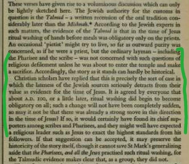 أن موضوع غسل الأيدي كان محل جدال كبير بين العلماء اليهود والمسيحيين. أشار العلماء اليهود أساسا ، بناءً على أدلة التلمود إلى أن غسل اليدين قبل الوجبات كان إلزامياااا فقط على الكهنة وليس على الناس العاديين مثل الفريسيين والكتبة. في حين أنه قد يكون من المحتمل أن بعض الفريسيين أو حتى العديد منهم قد خضعوا لهذه الطقوس طواعية أو طوعا فمن المؤكد أنه لا يمكن القول إن جميع إلى ه ود كانوا يتبعون هذا. وهكذا ارتكب مرقس خطأً في تعميم عادة لم يكن يمارسها الجميع في زمن يسوع،،،،،،،،،،،،،