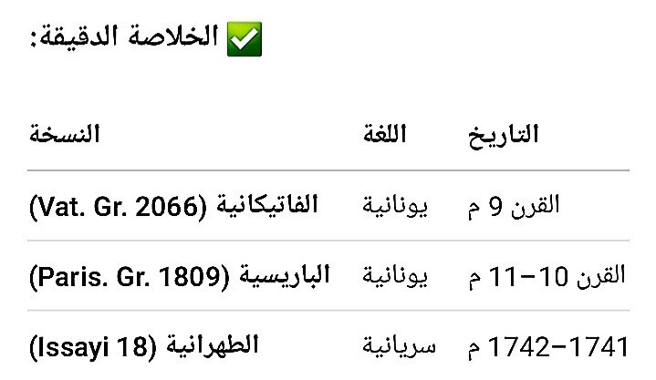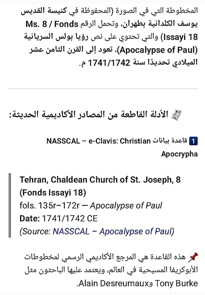 كذلك فان من أقدم المخطوطات الكاملة لهذه الرؤيا مخطوطة ايرانية سيريانية - وتعود المخطوطة نفسها للقرن الثامن عشر الميلادي وفقاً لافادة الذكاء الاصطناعي - أى أنها متأخرة أيضاً..